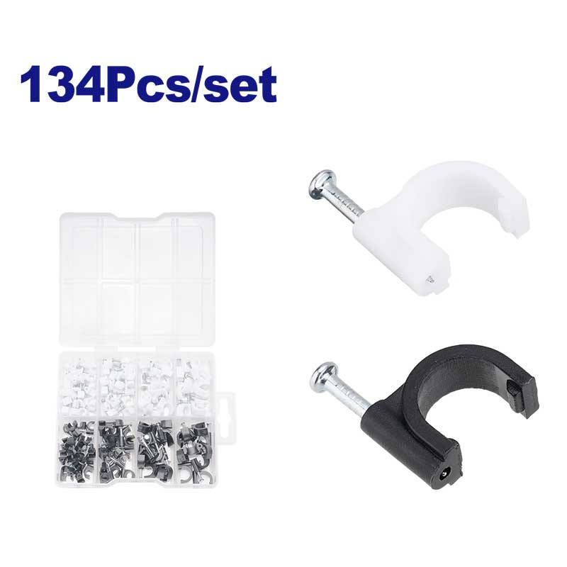 134 grapas de sujeción de cable en medidas de 5 mm, 6 mm, 8 mm y 10 mm.