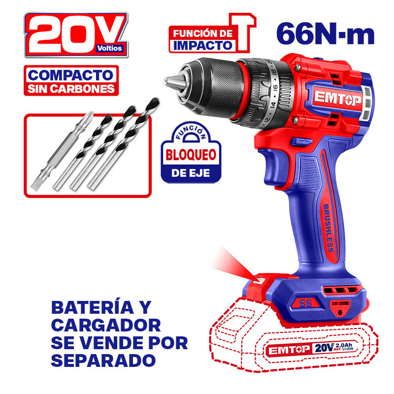 BARRENO/TALADRO PERCUTOR INALAMBRICO 20V,BRUSHLESS,MANDRIL DE 1/2,TORQUE 66NM,SIN BATERIA NI CARGADOR.BARE TOOL.EMTOP