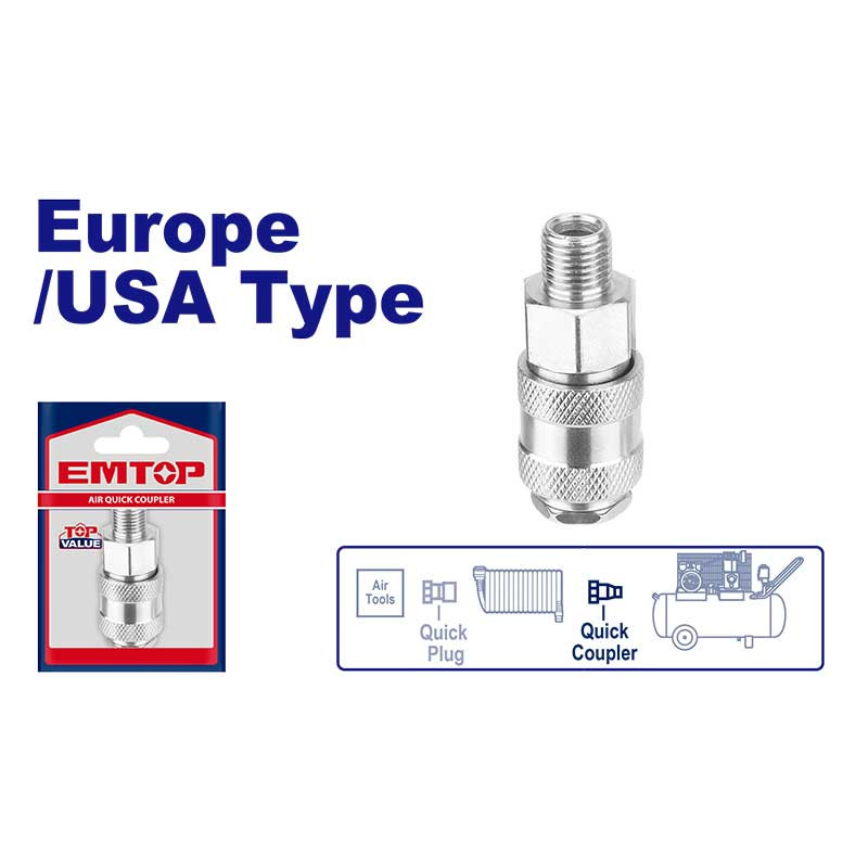 Acerca de este producto: - Acople rápido EMTOP para compresores de aire con rosca macho de 1/4 pulgadas, diseñado para un acoplamiento seguro y eficiente en sistemas neumáticos.