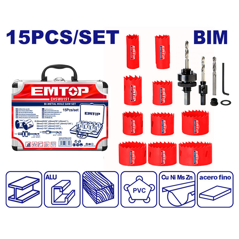 El juego de brocas sierra bimetálicas EMTOP EHSW0151 está diseñado para realizar perforaciones limpias y precisas en diversos materiales.