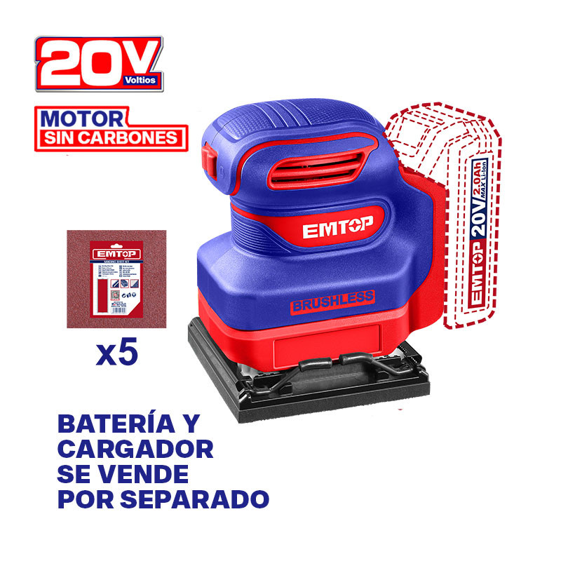 LIJADORA ORBITAL 1/4 DE HOJA INALAMBRICA, 20V. BRUSHLESS, 12,000 RPM, SIN BATERIA NI CARGADOR, (BARE TOOL). EMTOP
