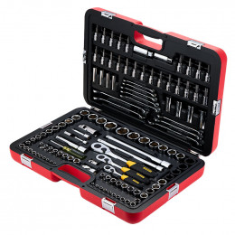 - Diseñado para uso profesional y automotriz, este set incluye una amplia variedad de dados, llaves, puntas, adaptadores, alicates y destornilladores, organizados para cubrir prácticamente cualquier tarea mecánica.