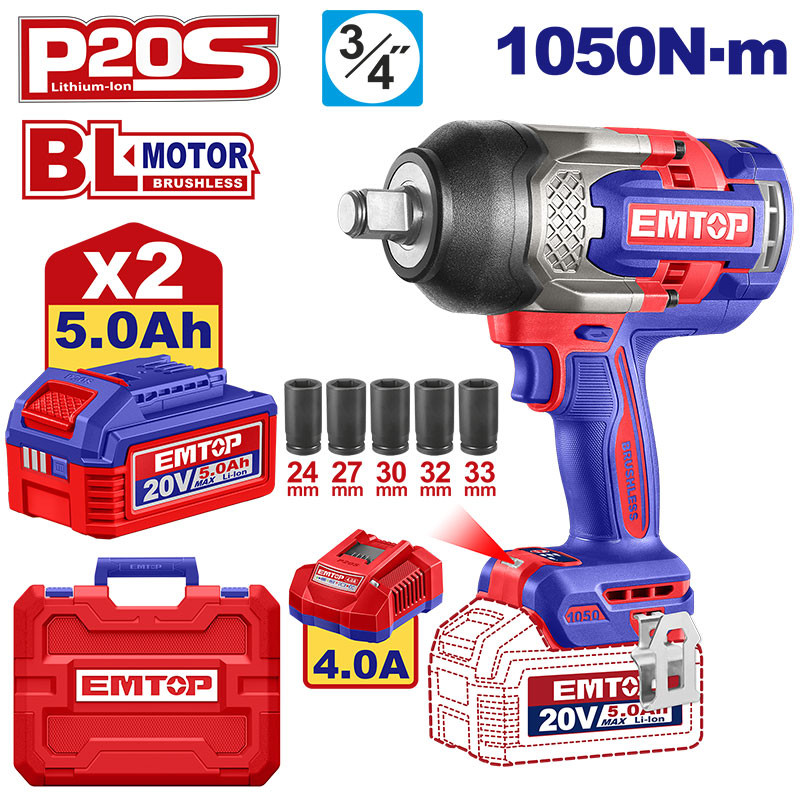 LLAVE DE IMPACTO INALAMBRICA EJE DE 3/4, 20V, BRUSHLESS, TORQUE 1050NM. EMTOP